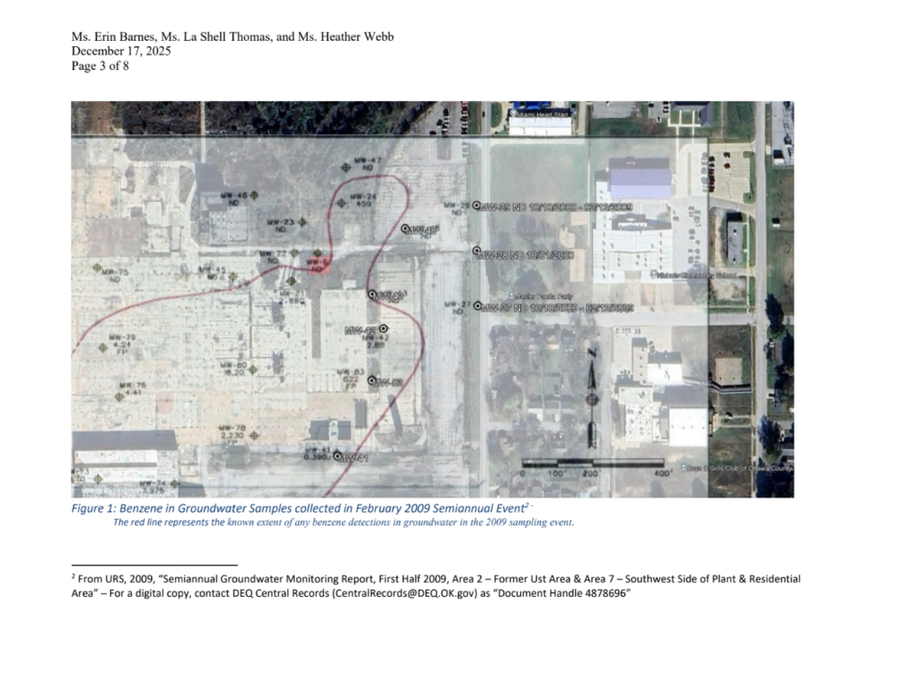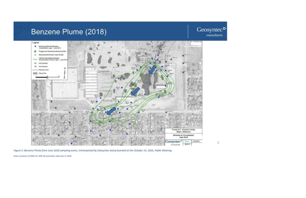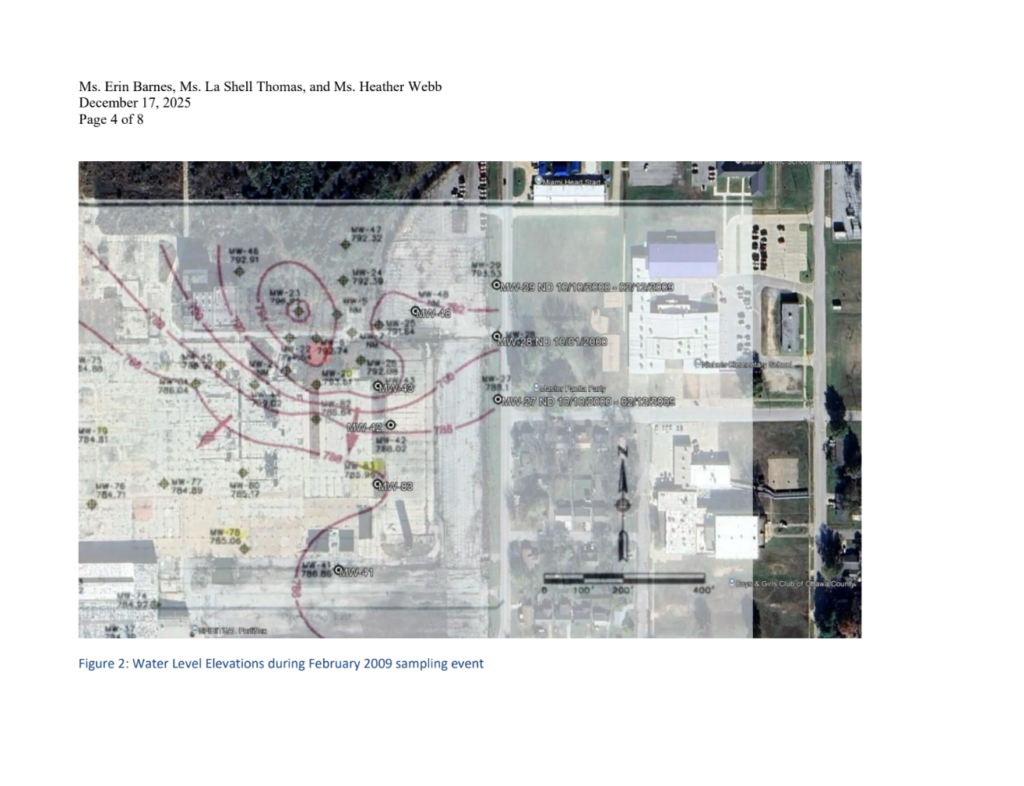 As shown in the distribution of dissolved benzene in 2009 (Figure 1) and in 2025 (Figure 3), benzene is not present in the groundwater outside of the areas identified in those figures. Figure 2 shows the water level elevations in 2009. The groundwater containing dissolved benzene was demonstrated to flow to the south-southwest, not towards Miami Head Start or Nichols Elementary School, and the plume was defined. The data showed that the groundwater containing benzene was moving away from the nearby Head Start and the Nichols Elementary School.